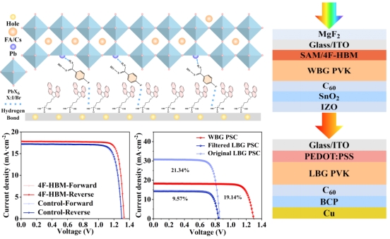 有机-无机杂化钙钛矿表现出优异的光电特性,使钙钛矿太阳电池在新型光伏技术中前景广阔。单结钙钛矿太阳电池已实现接近27%的光电转换效率(PCE),接近单结太阳电池的理论效率约33%)。通过降低热弛豫损失和提高太阳光谱利用,叠层太阳电池的理论效率可达44%左右。近年来,钙钛矿/晶硅、钙钛矿/钙钛矿(全钙钛矿)等叠层太阳电池取得了长足进步,展现出巨大潜力。宽带隙钙钛矿太阳电池在收集高能光子和为整个叠层器件提供高开路电压(VOC)方面发挥着至关重要的作用。然而,由界面缺陷和非辐射复合所导致的开路电压损失高和相分离严重等问题仍然阻碍着宽带隙钙钛矿太阳电池性能发展。埋底界面的调控对于高性能宽带隙钙钛矿太阳能电池至关重要,它会影响界面缺陷、电荷传输和钙钛矿结晶质量。钙钛矿薄膜的埋底界面通常存在各种带电缺陷,例如配位不足的Pb2+、卤化物空位、阳离子空位和反位缺陷等,由于其位于底部,这些缺陷很容易被忽略。因此,空穴传输层和钙钛矿层之间较差的界面质量可能导致严重的非辐射复合和传输损失,从而降低器件的效率和稳定性。研究者们通过埋底界面工程,不断提高宽带隙钙钛矿电池性能。然而,同时改善界面接触和钝化埋底界面仍面临巨大的挑战。因此,迫切需要通过选择合适的带有功能基团的界面修饰材料来桥接现有的自组装单分子层和钙钛矿层,以增强埋底界面的质量。