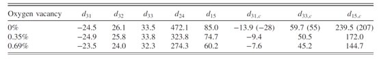 表1 不同浓度氧空位下正交相KNbO3中得到的压电系数及对应的陶瓷压电系数。