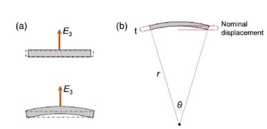 为此,朱建国教授团队通过理论推导与分子动力学模拟相结合,系统研究了电致弯曲形变的起源,证明压电体的弯曲可由厚度方向上 d31 的非零梯度所驱动,并建立了名义应变与样品尺寸、电场强度及 d31 梯度之间的定量关系: