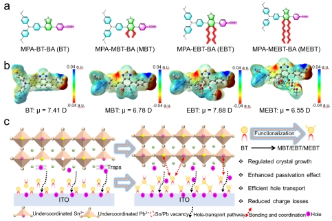基于之前的研究工作,即通过乙二酸(OA)修饰Sn-Pb窄带隙底电池中传统空穴传输层PEDOT:PSS以改善空穴传输路径并诱导高质量Sn-Pb钙钛矿薄膜生长(Sci. Adv. 2024, 10, adl2063设计新型的给受体P型材料MPA2F-BT-BA2F)取代PEDOT:PSS作为窄带隙底电池的空穴传输材料并同时适用于宽带隙顶电池以构建高效的全钙钛矿叠层太阳电池(Nat. Energy 2023, 8, 714-724,本研究以典型的给受体SAM分子 MPA-BT-BA BT为基础,在苯并噻唑单元上引入了不同长度的低聚醚侧链(即甲氧基、2-甲氧基乙氧基、2-(2-甲氧基乙氧基)乙氧基),分别制备了MPA-MBT-BA MBT)、MPA-EBT-BA EBT)和MPA-MEBT-BAMEBT)等目标分子,并通过构建高效的空穴选择性接触(HSCs)制备高性能的Sn-Pb窄带隙钙钛矿及全钙钛矿叠层太阳电池。