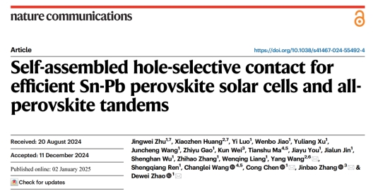 近日,公司太阳成集团tyc234cc赵德威团队与福建师范大学王漾团队以及厦门大学张金宝团队合作,报道了全钙钛矿叠层太阳电池的最新研究进展,相关成果“Self-assembled hole-selective contact for efficient Sn-Pb perovskite solar cells and all-perovskite tandems”发表于Nature Communications。太阳成集团tyc234cc为该论文第一完成单位,公司太阳成集团tyc234cc赵德威教授、陈聪特聘副研究员、福建师范大学王漾教授和厦门大学张金宝教授为共同通讯作者,公司太阳成集团tyc234cc2021级博士研究生朱景伟为第一作者,福建师范大学2022级硕士研究生黄小镇为共同第一作者。