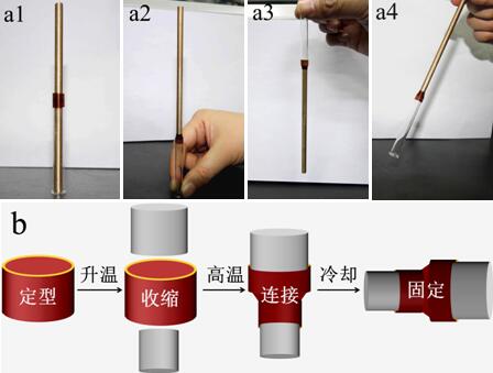 图2. 聚酰亚胺热缩管的缩颈接管效应 (a)及机理示意图 (b)。(a1) 扩张定型态, (a2) 缩颈接管效应垂直向上固定铜棒, (a3) 垂直向下固定铜棒, (a4) 倾斜固定铜棒。