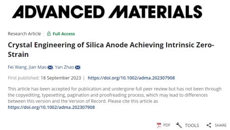近日,公司毛健教授团队在材料学顶级期刊Advanced Materials发表题为:Crystal Engineering of Silica Anode Achieving Intrinsic Zero-Strain的研究。第一作者为副研究员(专职科研)王飞,该文通讯作者为太阳成集团tyc234cc的毛健教授和赵焱教授,第一作者单位为太阳成集团tyc234cc。该研究提出了一种新型的零应变硅基负极材料结构设计方式,对于硅基负极材料的科学研究和商业化都具有重要意义。