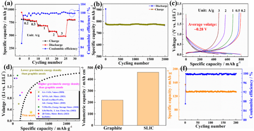 图2. SLIC的(a)倍率性能、(b)循环性能和(c)充放电曲线图;(d)SLIC的质量能量密度和(e)体积能量密度稍微比较;(f) SLIC||LiFePO4全电池的循环性能图