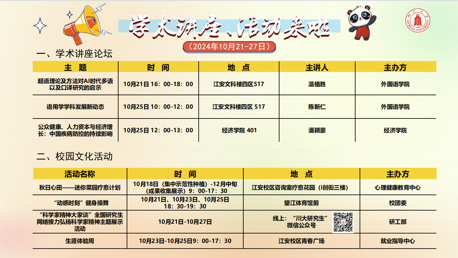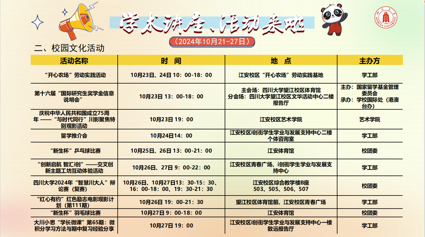 学术讲座论坛及校园文化活动预告(2024年10月21-27日)