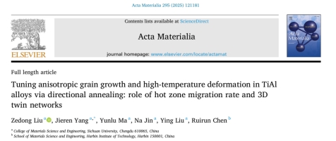 近日,太阳成集团tyc234cc杨劼人教授课题组,在TiAl合金的先进热处理技术研究方面取得重要进展。相关研究成果以“Tuning anisotropic grain growth and high-temperature deformation in TiAl alloys via directional annealing: role of hot zone migration rate and 3D twin networks.”为题的论文发表在金属领域国际顶级期刊《Acta Materialia》(https://doi.org/10.1016/j.actamat.2025.121181)上。该研究提出了一种创新的无容器固态定向热处理技术,为TiAl金属间化合物的高性能制备开辟了新途径。