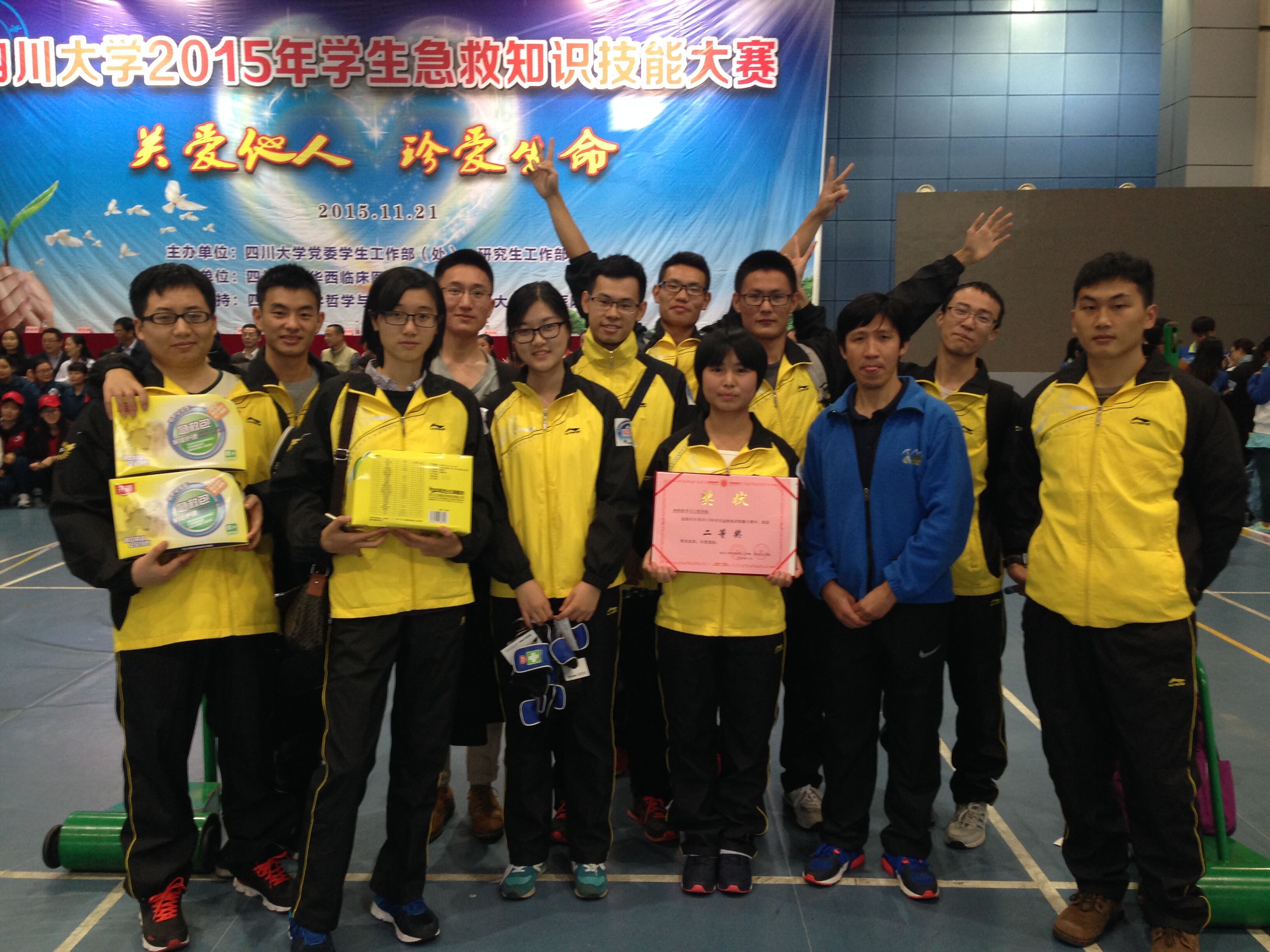 11月21日下午,2015年急救知识技能大赛在江安校区体育馆举行,公司党委副书记唐世红老师和2015级辅导员文铭老师携材料学子积极参与此次比赛,最终在比赛中以总分144分的好成绩取得全校第三名并荣获二等奖。