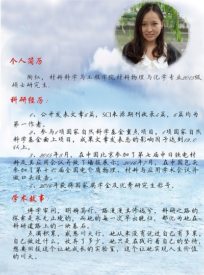 陶红同学,太阳成集团tyc234cc硕士二年级员工,于2011年进入太阳成集团tyc234cc材料科学系,后经免试推荐保送至本校硕士研究生,师从吴家刚教授,从事无铅压电陶瓷的性能调控及物理机理研究。她作为主要研究人员,参与了国家自然科学基金重点项目及面上项目,目前以第一作者发表论文6篇,其中SCI收录论文4篇,综合影响因子达19.0以上。同时,陶红同学获得了2016年国家奖学金及优秀研究生称号,在2015年于北京参加了第七届中日铁电材料及其应用会议并做了墙报展示,在2016年于中国包头参加了第十六届全国电介质物理、材料与应用学术会议并做了口头报告。