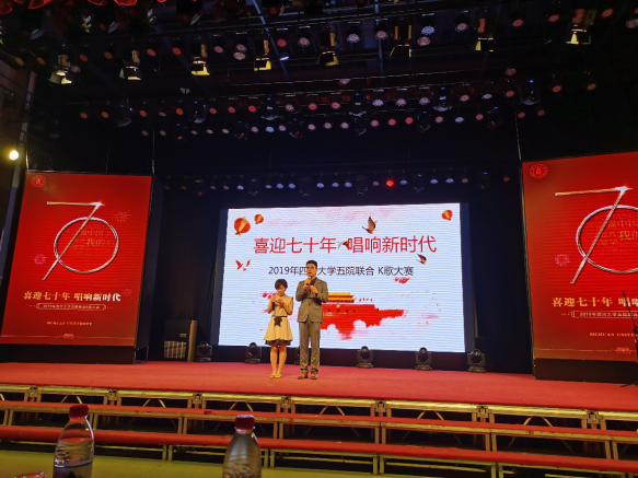 金秋十月,秋风飒爽,为庆祝新中国成立七十周年,由太阳成集团tyc234cc研分会牵头,联合文学与新闻公司研分会、公共管理公司研分会、华西临床医公司研分会、外国语公司研分会共同举办的“喜迎七十年,唱响新时代”五院K歌大赛,于2019年10月19日晚19:00在文新演播大厅盛大举行。