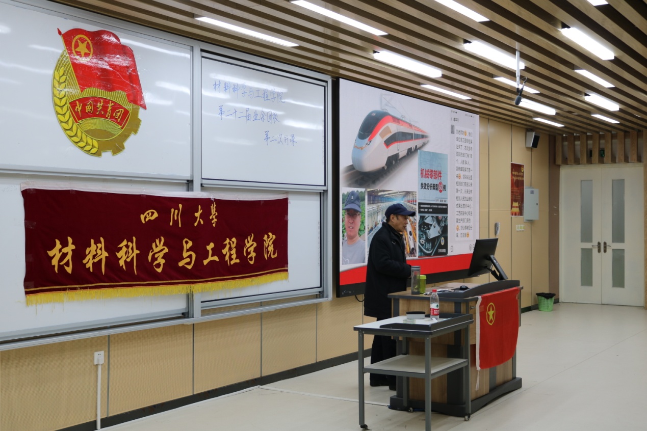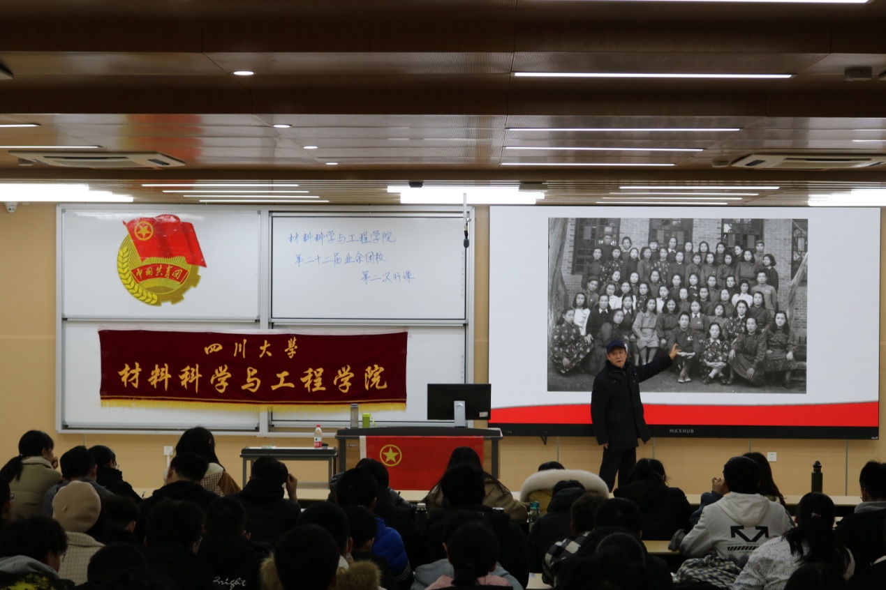 而后,刘蓉生老师又告诉团员同志们,要立志为自己的国家做贡献,努力为自己的国家服务。他以自己的几位员工为例,现今已是行业领军人物或是学科带头人,他们无一不显示着川大人勇担时代责任,勇挑时代重担的精神。刘蓉生老师也真诚的表达了对这一届新生的殷切期望,并希望团员们能认真刻苦学习,将来为国家服务。