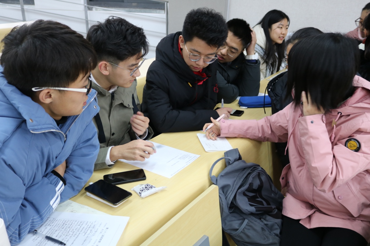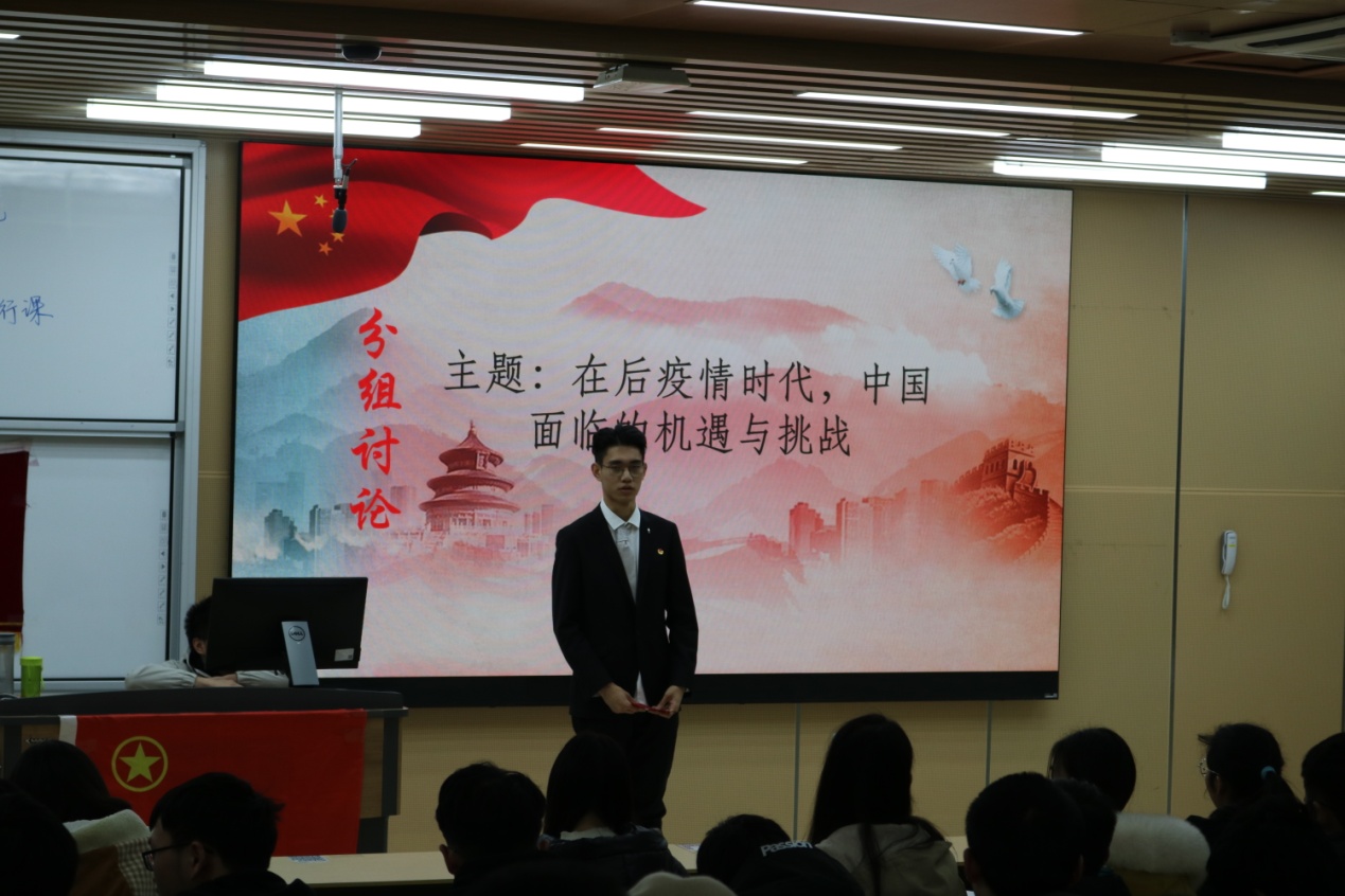 同学们在小组内踊跃发言,积极贡献自己的想法,在激烈的讨论之后,主持人邀请四位同学上台发言分享,结合当前中国的经济,医疗以及法律方面,交流自己对于中国在疫情时期所面临的机遇与挑战的看法。