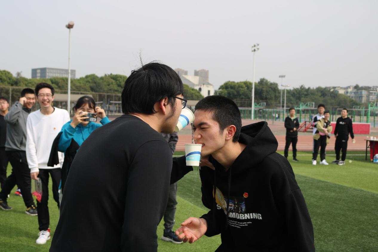 精彩不断,游戏不停。“游戏接龙”是本次活动的重头戏。“游戏接龙”由三部分组成——“转布条”、“杯水车薪”、“运气球”。 “转布条”相当考验两名队员的默契度,要求一松一紧频率同步才能成功接力,一个个高速旋转的“小陀螺”让人瞠目结舌。“杯水车薪”无疑是本场游戏的难点和爆笑点,咬紧牙关、纸杯的倾斜以及身体的协调,过程曲折但气氛愉快。运气球的两名队员背靠背夹住气球接力奔向终点,尽己所能为小组拿分。在紧张刺激的游戏中,学员们不仅收获了快乐,同时也培养了沟通和协作的能力。
