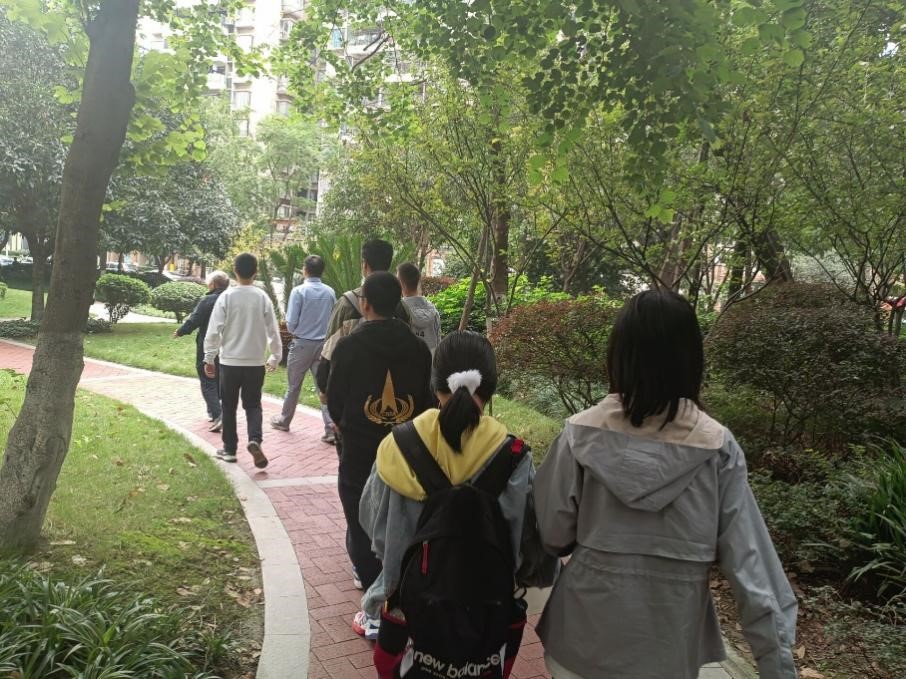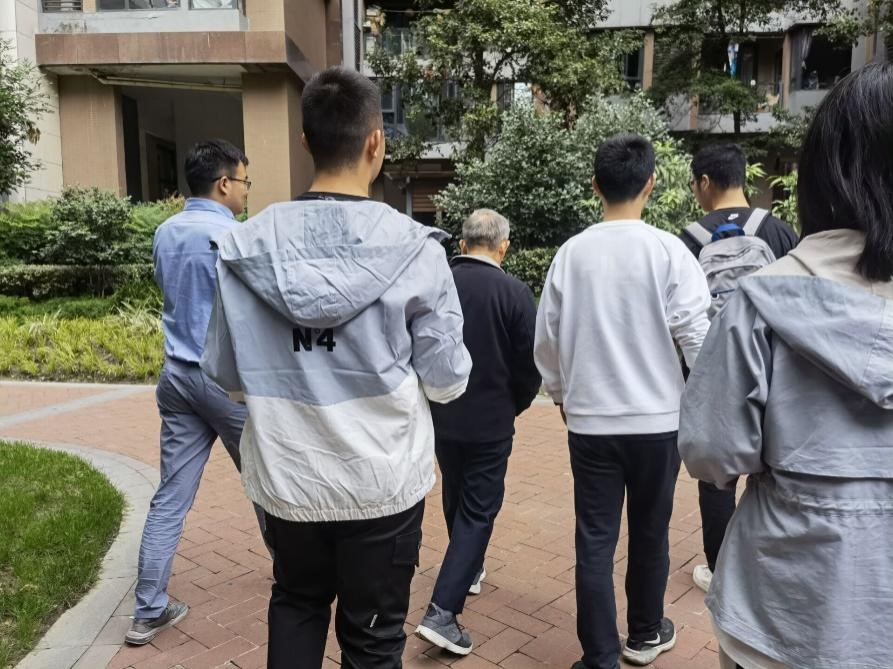 在看望郑家贵老师时,老师早早就在小区门口等候同学们。和同学散步的途中,郑家贵老师回忆起自己承担国家重点攻关项目的经历,并讲述了许多过往趣事。余鹏飞老师向郑老师介绍了公司近年的发展以及取得的成绩。离别之际,郑老师勉励同学们好好学习、发奋图强。