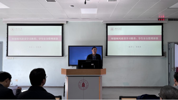 张晓满副书记开展了作师德师风建设学习教育。他结合典型案例给全院教职工做师德师风警示教育,并指出,要以案为鉴,深刻反思深刻汲取案例教训,增强责任感和使命,认真进行自我审视,警钟长鸣,严以律己。会上,张晓满副书记就员工安全管理工作进行安排部署,要求导师进一步做好员工稳定安全的风险防控和隐患排查,了解员工思想动态、全面提升员工安全稳定工作的针对性和实效性。